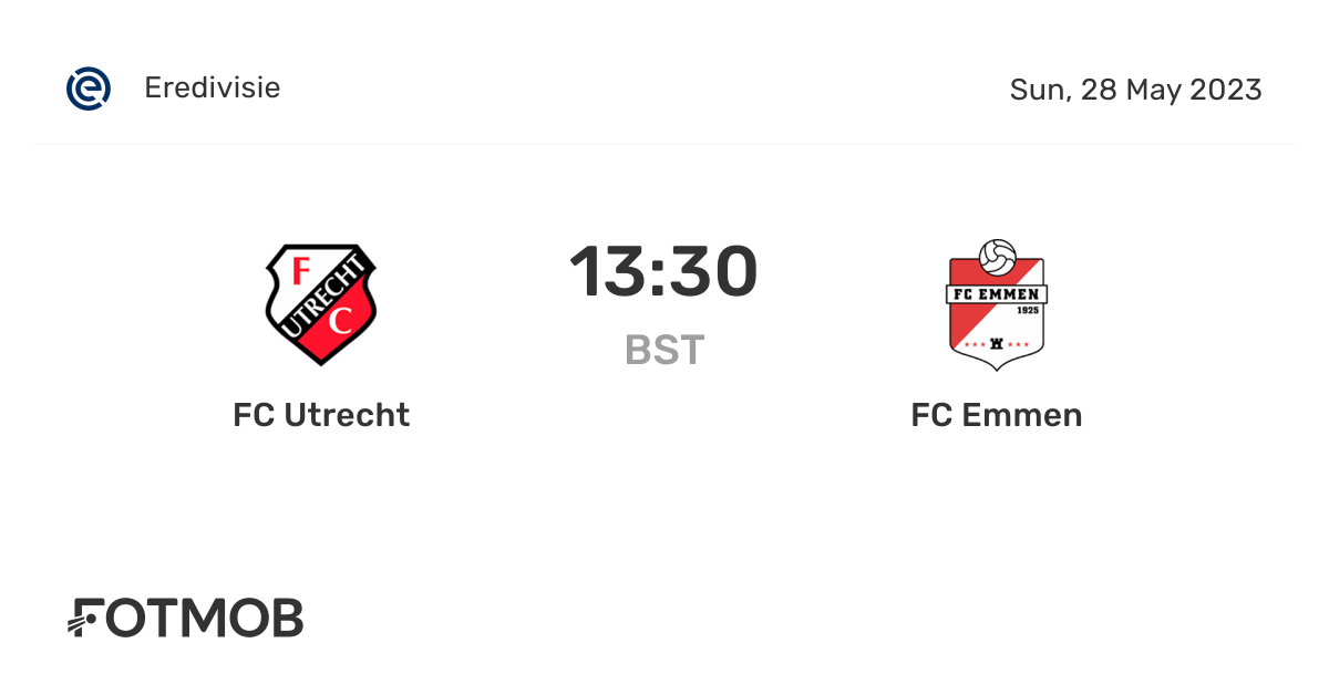 Eredivisie. Programma & Uitslagen. 2022-2023. FC Utrecht - FC Emmen. Utrecht. 3 - 2. Emmen. Eredivisie. Zo 28 mei 2023, 14:30. Stadion Galgenwaard Utrecht. Overzicht Opstellingen.