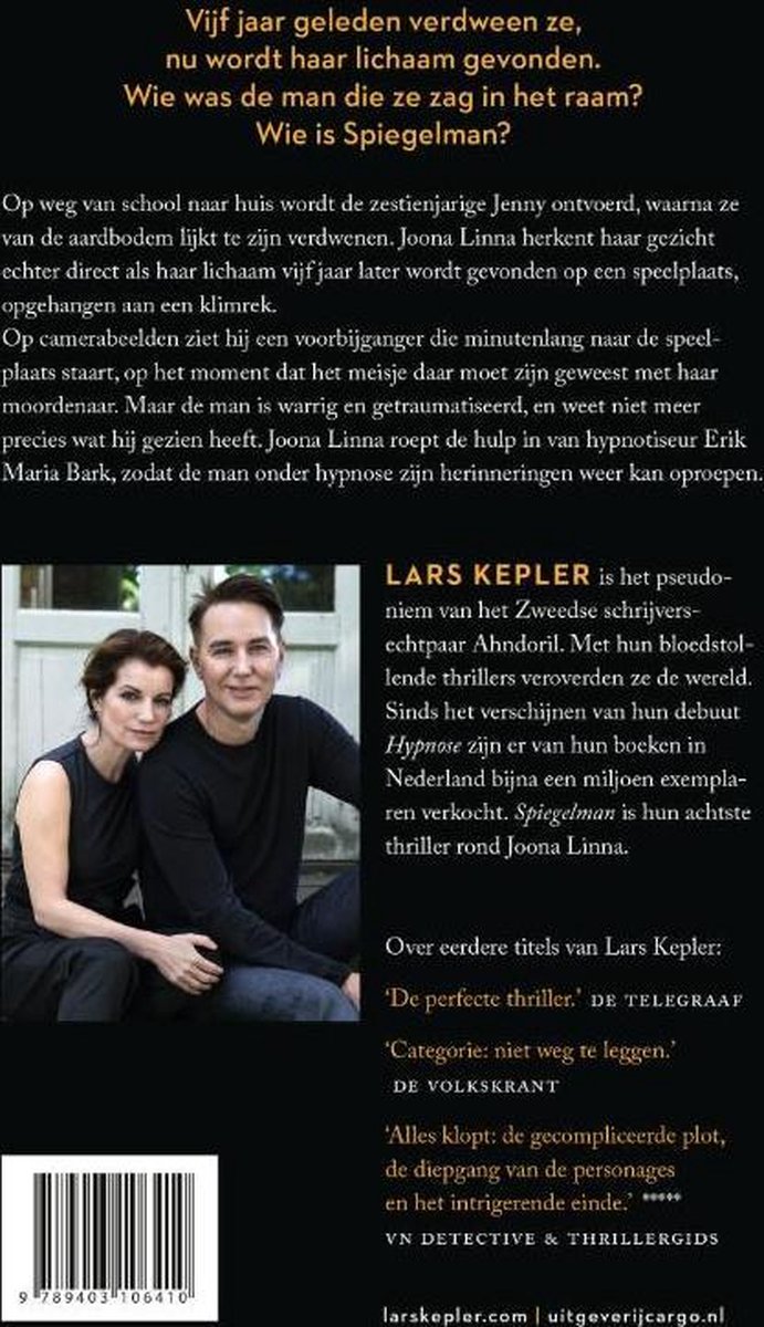 Klik hier om het boek te bestellen op Bol.com. Spiegelman. Klik hier om het boek te bestellen op Bol.com. Informatie over Lars Kepler. Wist je dat Lars Kepler het pseudoniem is van het echtpaar Alexander Ahndoril (1967) en Alexandra Coelho Ahndoril (1966)? Het stel debuteerde in 2009 met Hypnose.